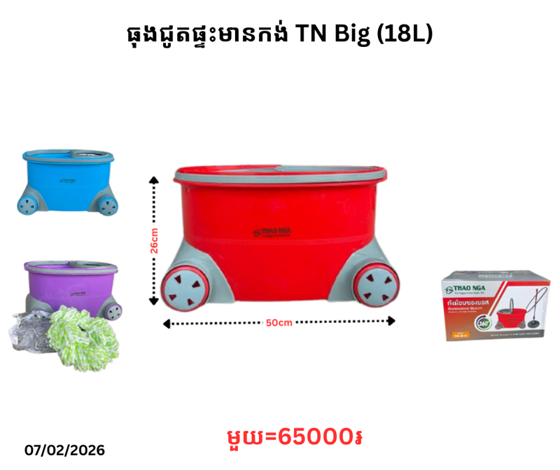ធុងជូតផ្ទះមានកង់ TN Big (18L) December 7, 2025 Posted in 65000, TN, ធុងជូតផ្ទះ, ធុងជូតផ្ទះ TN Product Code : P0007767